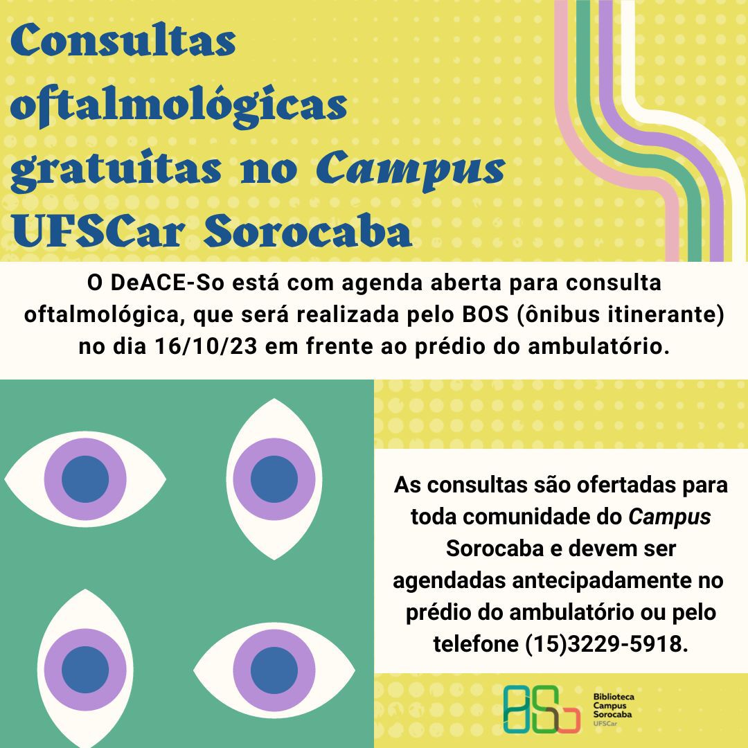 O DeACE-So está com agenda aberta para consulta oftalmológica, que será realizada pelo BOS (ônibus itinerante) no dia 16/10/23 em frente ao prédio do ambulatório.As consultas são ofertadas para toda comunidade do campus Sorocaba e devem ser agendadas antecipadamente no prédio do ambulatório ou pelo telefone (15)3229-5918.